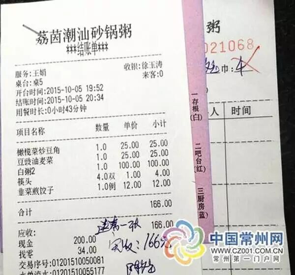 正当青岛大虾纠纷渐趋退出人们的视野之时,江苏常州“百元白粥”纠纷又成为热议的话题。据报道,国庆期间,常州市民在本地晋陵路的荔茵潮汕粥就餐,点了一锅白粥,结账时发现一锅白粥的售价竟要100元,这款100元一锅的白粥未明列于菜单上。粥店在网上进行“澄清”,称这锅粥是应客人要求专门特制,耗时半个多小时,成本也较高,且100元的价格是事先跟客人说明的。客人对此否认,并出示账单点餐时间为7点52分,结账时间是8点34分,用时42分。经物价部门认定,店家违反明码标价规定,责令店家退还客人100元,向客人赔礼道歉,并按照规定对店家罚款5000元。